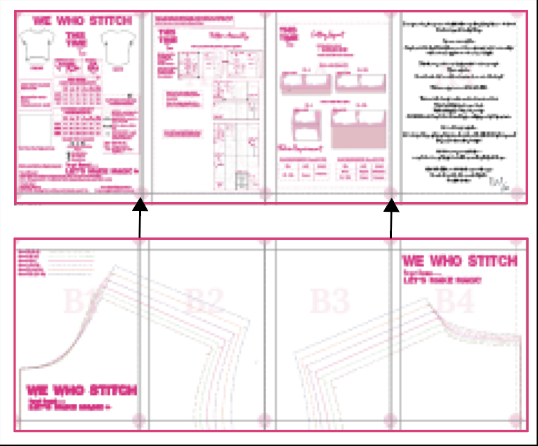 Match up the lines and circle markers AS BEST AS YOU CAN – we are not performing brain surgery. Don’t stress out if things are a little off. The actual pattern lines matching back together are FAR more important than a slightly wonky marker. Our domestic printers are not perfectionists – they can;t help goping a little off-piste every now and then. Don’t let that give you a headache!