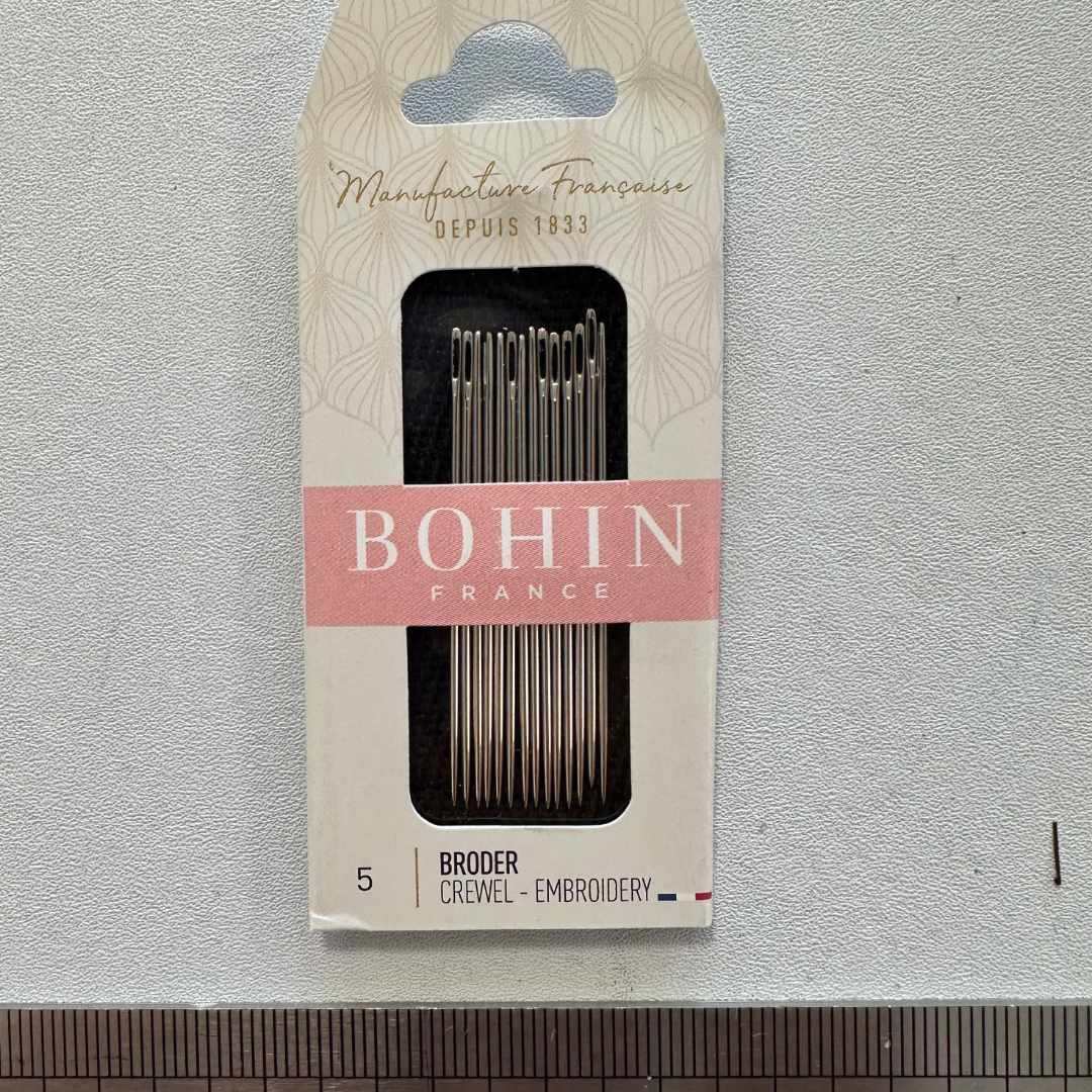 Bohin France crewel embroidery needles are beautifully made, smooth, and a pleasure to stitch with. The No. 5 size is a We Who Stitch favourite — fine enough for detailed embroidery, yet strong and versatile enough for mending, embellishing garments, and working with silk embroidery floss.